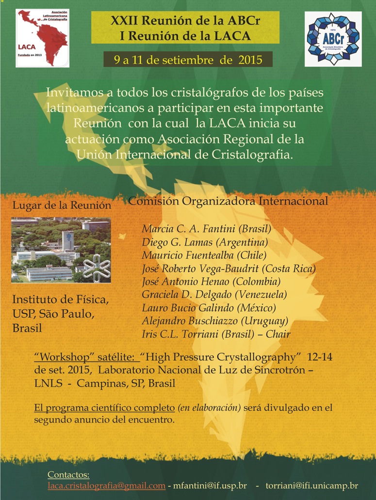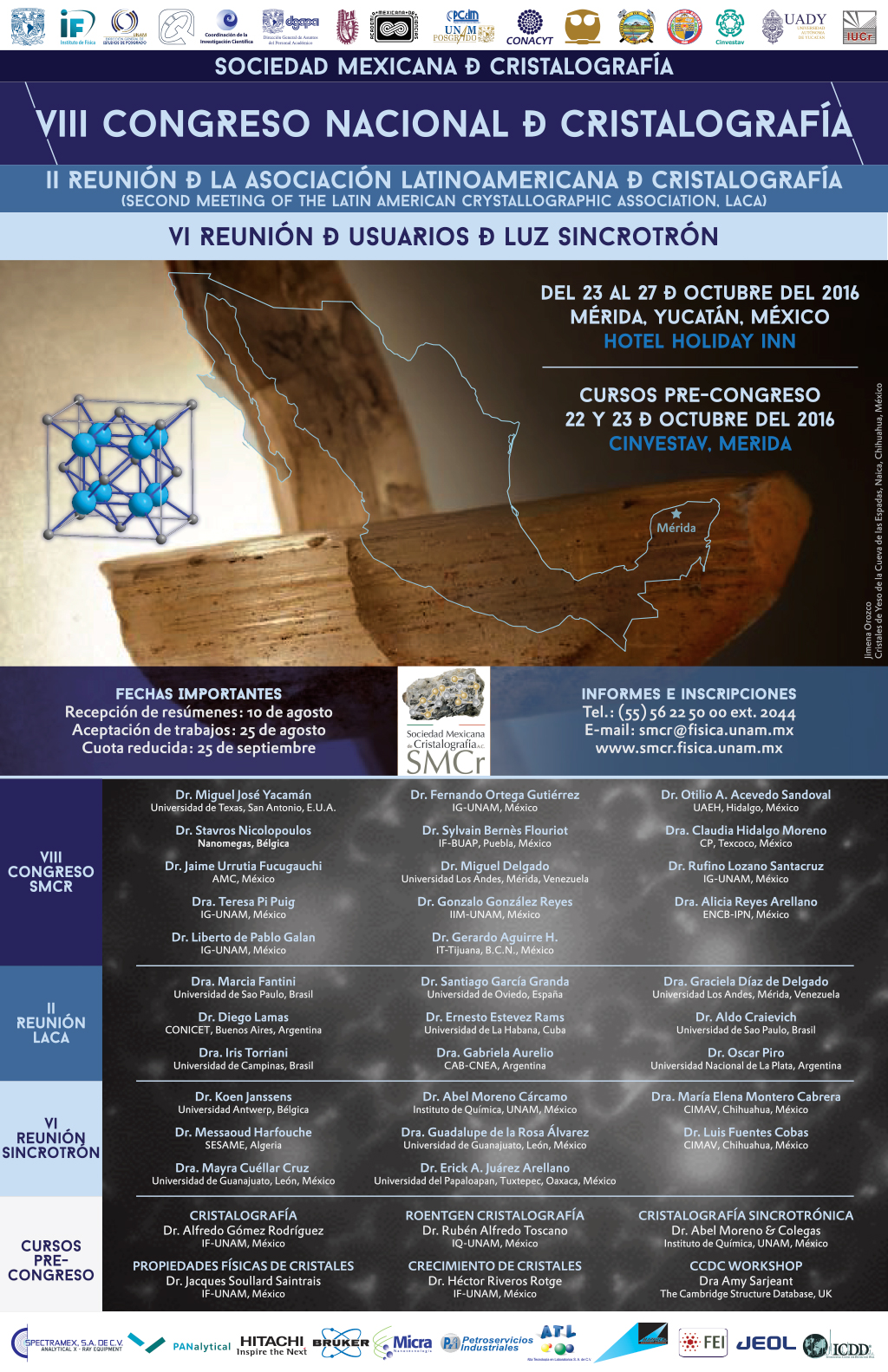 Las Mesas Directivas de la Asociación Latinoamerica de Cristalografía (LACA) y de la Sociedad Mexicana de Cristalografía (SMCr) y el Comité Organizador Local los invita muy cordialmente a la II Reunión de laLACA, que se realizará en la Ciudad de Mérida, Yucatán, México, del 24 al 27 de octubre de 2016 junto con el VIII Congreso Nacional de Cristalografía de México y la Sexta Reunión de Usuarios de Luz Sincrotrón.